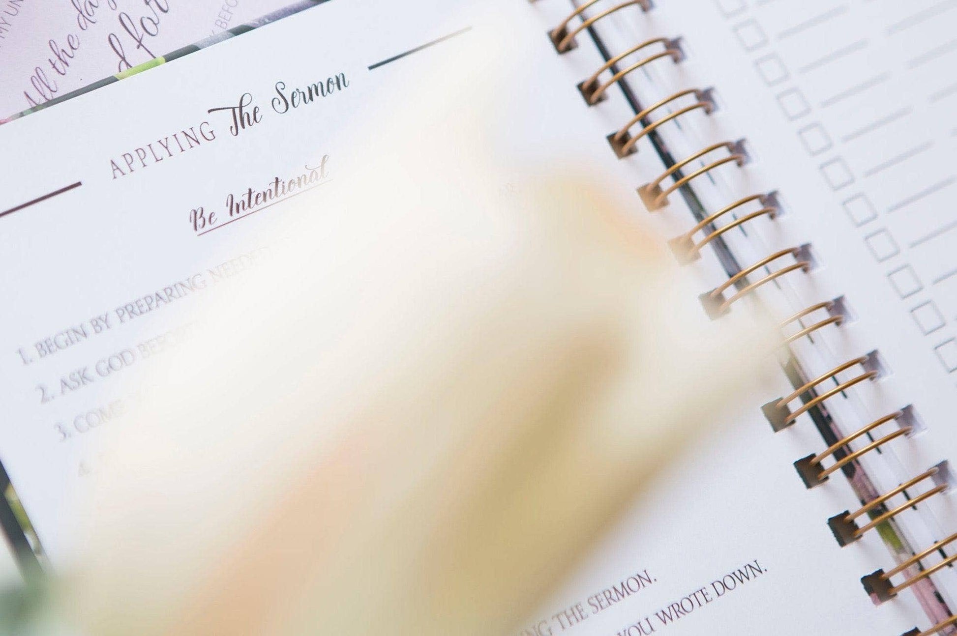 The Sermon Notes journal is a powerful addition to your church bag. Uniquely designed with a spot for every key element, this sermon notebook will keep you on track from the moment the sermon starts while creating a lasting impact as you review it throughout the week. This hardcover sermon notes journal includes " Applying the Sermon" with tips and tricks to help you apply the weekly sermon to your life and a prayer list to keep up with requests.